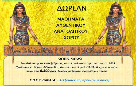 ...Οι πρωτοβουλίες που πήρε το Εξειδικευμένο Κέντρο Διδασκαλίας Ανατολίτικου Χορού GADALA από 2015, και κάθε έτος να προσφέρει 100 ώρες ΔΩΡΕΑΝ μαθημάτων ανατολίτικου χορού βρήκε θερμή ανταπόκριση και προσέφερε πολλά χαμόγελα! ...Αντιλαμβανόμενοι την ακόμη πιο δύσκολη οικονομική συγκυρία που αντιμετωπίζει η χώρα μας λόγω της πανδημίας COVID-19 και θέλοντας να υποστηρίξει την προσπάθεια όλων μας για σωματική και ψυχική ισορροπία, το Εξειδικευμένο Κέντρο Διδασκαλίας Ανατολίτικου Χορού GADALA ανακοινώνει την κλήρωση ενός ΔΩΡΕΑΝ πακέτου ομαδικών μαθημάτων αυθεντικού (Belly dance) ανατολίτικου χορού !
