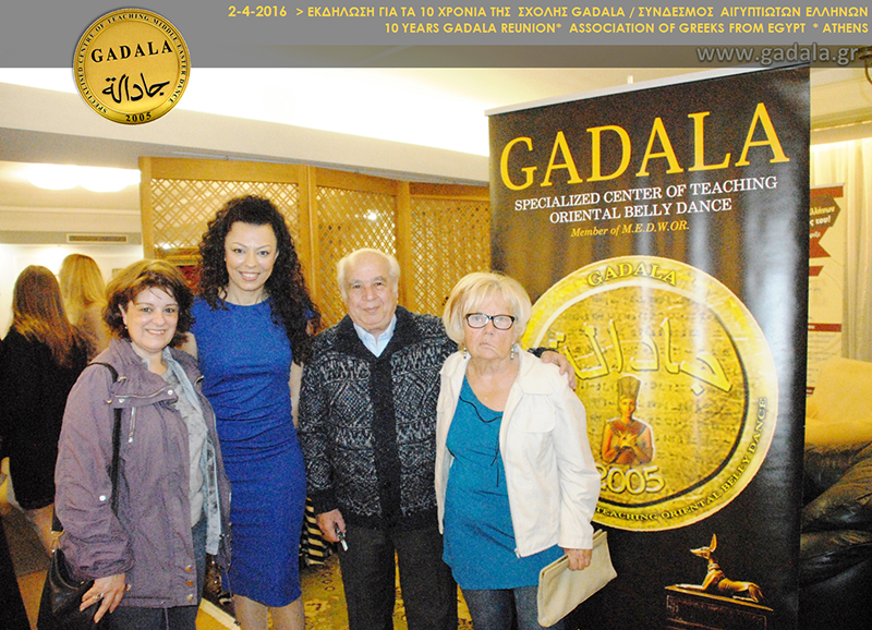 Θέλω να ευχαριστήσω προσωπικά το πρόεδρο του Συνδέσμου Αιγυπτιωτών Ελλήνων κ. Κώστα Μιχαηλίδη μετά της συζύγου του, την υπεύθυνη πολιτιστικών του συνδέσμου κα. Ηλιάνα Θεμιστοκλέους και τον υπεύθυνο εκδηλώσεων του συνδέσμου κ. Χρήστο Χριστοφίδη που στις 2 Απριλίου 2016, με τίμησαν με την παρουσία σας, στην επέτειο για τα δέκα χρόνια συμπλήρωσης από την ίδρυση του Εξειδικευμένου Κέντρου Διδασκαλίας Ανατολίτικου Χορού GADALA!