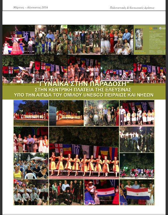 Ο τιμώμενος στο μήνα λαογραφίας Σύλλογος Εθελοντών Θριασίου Πεδίου σε συνεργασία με το Ν.Π.Δ.Δ. Π.Α.Κ.Π.Π.Α. του Δήμου Ελευσίνας και υπό την αιγίδα του Ομίλου για την UNESCO Πειραιώς και Νήσων παρουσίασε χορευτικά σύνολα με παραδοσιακούς χορούς από διάφορες χώρες! Στην καρδιά της φιλόξενης Ελευσίνας, έγινε για άλλη μια φορά μια πετυχημένη παρουσίαση της Επαγγελματική Χορευτικής Ομάδας Παραδοσιακού Αιγυπτιακού Χορού GADALA, στα πλαίσια του μήνα λαογραφίας 2016 του Δήμου Ελευσίνας με θέμα «Γυναίκα στην Παράδοση». Ακολούθησε η Βράβευση της χορογράφου-χοροδιδασκάλου κ. Φωτεινής Gadala με τιμητική διάκριση που απονεμήθηκε από τον κο Ιωάννη Μαρωνίτη, Πρόεδρο του Ομίλου για την UNESCO Πειραιώς και Νήσων και Μέλος του Εκτελεστικού Συμβουλίου της Παγκόσμιας Ομοσπονδίας Ομίλων, Συλλογών και Κέντρων UNESCO (WFUCA) για την Ευρώπη και τη Βόρεια Αμερική, προκειμένου να τιμήσει την συνεισφορά της στις Δράσεις Πολιτισμού και την αναγνώριση των προσπαθειών της να συνεισφέρει στη διάδοση του ανατολίτικου χορού και της πλούσιας Αιγυπτιακής κουλτούρας.