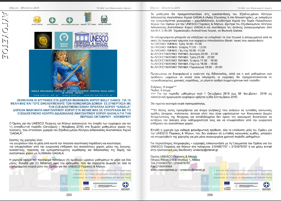 Το Εξειδικευμένο Κέντρο Διδασκαλίας Ανατολίτικου Χορού GADALA συμμετέχει ενεργά στις δράσεις του Ομίλου UNESCO Πειραιώς & Νήσων!
