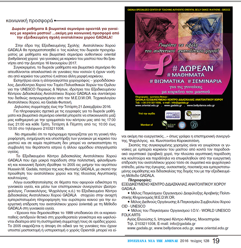 Ο Όμιλος για την UNESCO Πειραιώς & Νήσων, αναγνωρίζει την σπουδαιότητα του κοινωνικού και πολιτιστικού έργου της Εξειδικευμένης Σχολής Αιγυπτιακού Χορού GADALA, σας προσκαλεί στα δίωρα σεμινάρια ανατολίτικου χορού (χοροί bellydance) φιλανθρωπικής δράσης με σύνθημα «Συμμετέχουμε στην Εκστρατεία Ενημέρωσης για τον Καρκίνο, Στηρίζουμε το Έργο της Ελληνικής Αντικαρκινικής Εταιρείας» που μέρος των εσόδων θα διατεθεί για την οικονομική ενίσχυση της Ελληνικής Αντικαρκινικής Εταιρείας.