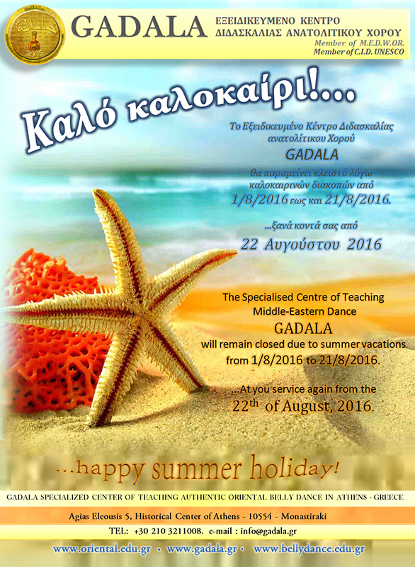 Καλό Καλοκαίρι!!!Happy Summer Holiday!!! Το Εξειδικευμένο Κέντρο Διδασκαλίας Ανατολίτικου Χορού Gadala δεν θα πραγματοποιεί μαθήματα από Δευτέρα 1 Αύγουστου 2016 μέχρι και Παρασκευή 19 Αυγούστου 2016!