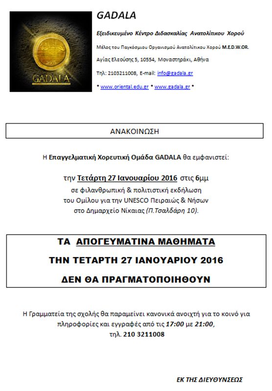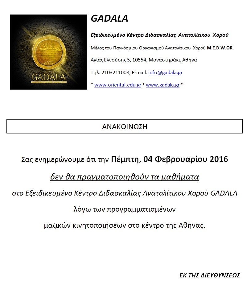ΠΕΜΠΤΗ 4 ΦΕΒΡΟΥΑΡΙΟΥ 2016 ΑΝΑΒΟΛΗ ΜΑΘΗΜΑΤΩΝ ΟΡΙΕΝΤΑΛ ΧΟΡΟΥ ΣΤΗΝ ΣΧΟΛΗ ΧΟΡΟΥ GADALA ΛΟΓΩ ΚΙΝΗΤΟΠΟΙΗΣΕΩΝ... |