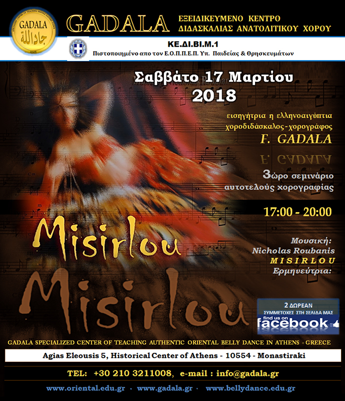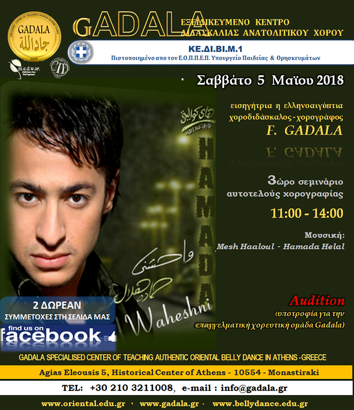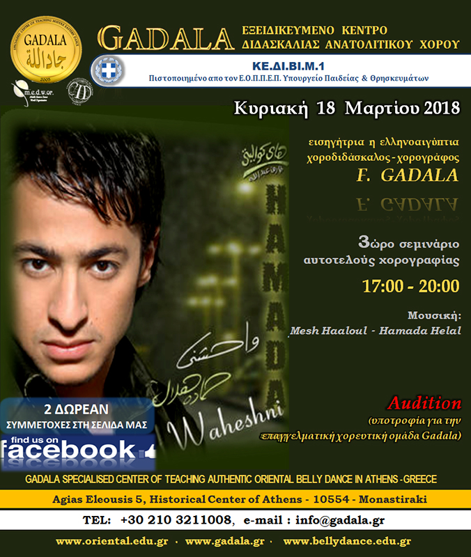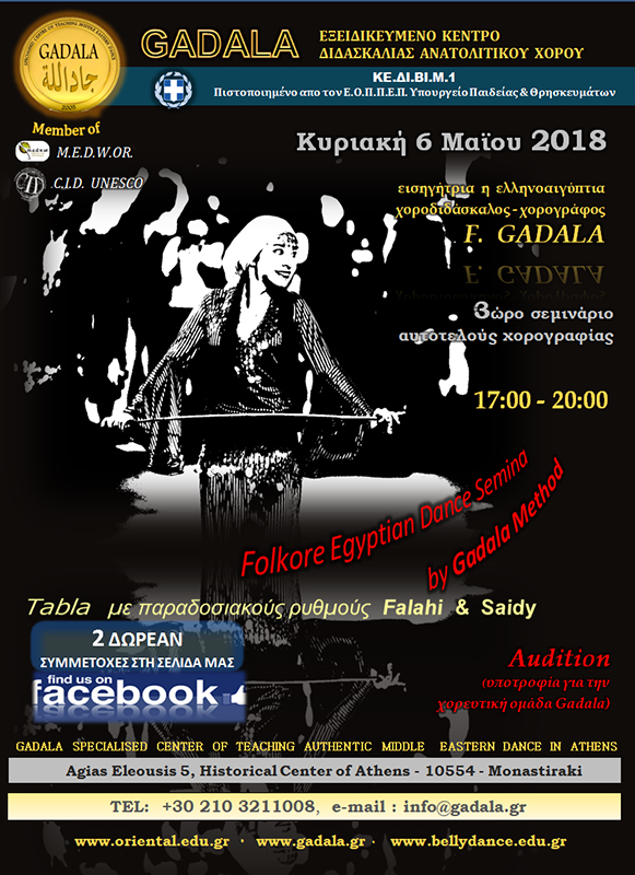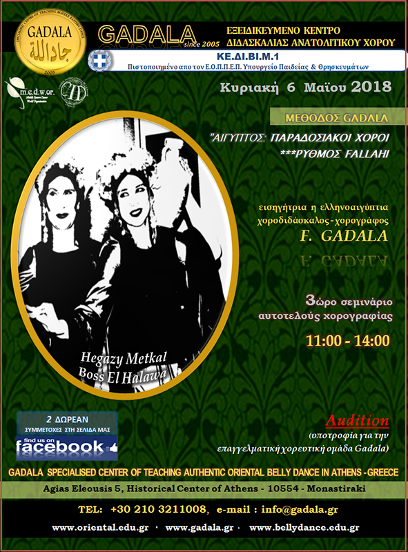 Το Εξειδικευμένο Κέντρο Διδασκαλίας Ανατολίτικου Χορού GADALA, που λειτουργεί πλέον ως Πιστοποιημένο ΚΕ.ΔΙ.ΒΙ.Μ.1 & Αναγνωρισμένο Εκπαιδευτήριο από το Υπουργείο Παιδείας, ανακοινώνει την επανάληψη του επιτυχημένου σεμιναρίου με τίτλο «ΠΑΡΑΔΟΣΙΑΚΟΙ ΑΙΓΥΠΤΙΑΚΟΙ ΧΟΡΟΙ : MELAYA LAFF & HAGALLA» την Κυριακή 22 Απριλίου 2018... |