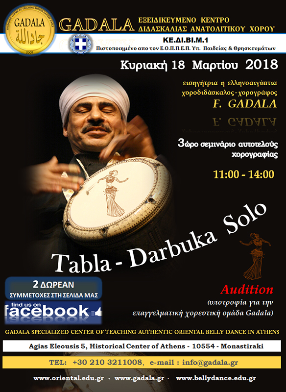 Το Εξειδικευμένο Κέντρο Διδασκαλίας Ανατολίτικου Χορού GADALA, που λειτουργεί πλέον ως Πιστοποιημένο ΚΕ.ΔΙ.ΒΙ.Μ.1 & Αναγνωρισμένο Εκπαιδευτήριο από το Υπουργείο Παιδείας, ανακοινώνει την επανάληψη του επιτυχημένου σεμιναρίου με τίτλο «Η ΜΕΘΟΔΟΣ GADALA ΣΕ ΜΟΥΣΙΚΗ ΤΟΥΜΠΕΡΛΕΚΙ (TABLA - DARBUKA SOLO) » την Κυριακή 18 Μαρτίου 2018... |
