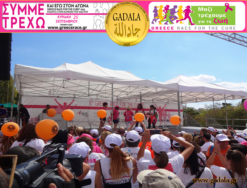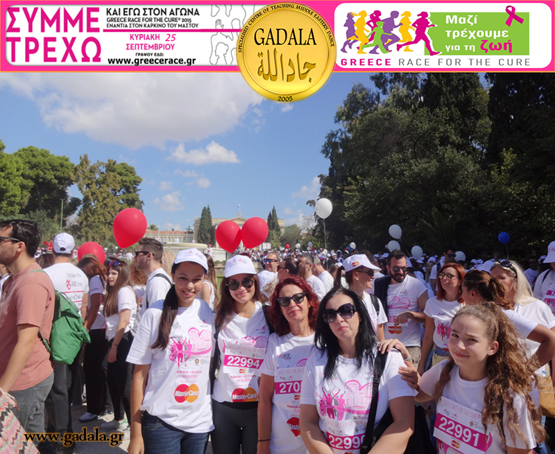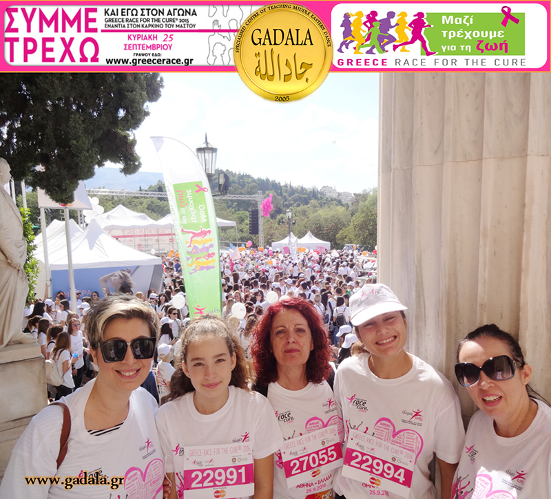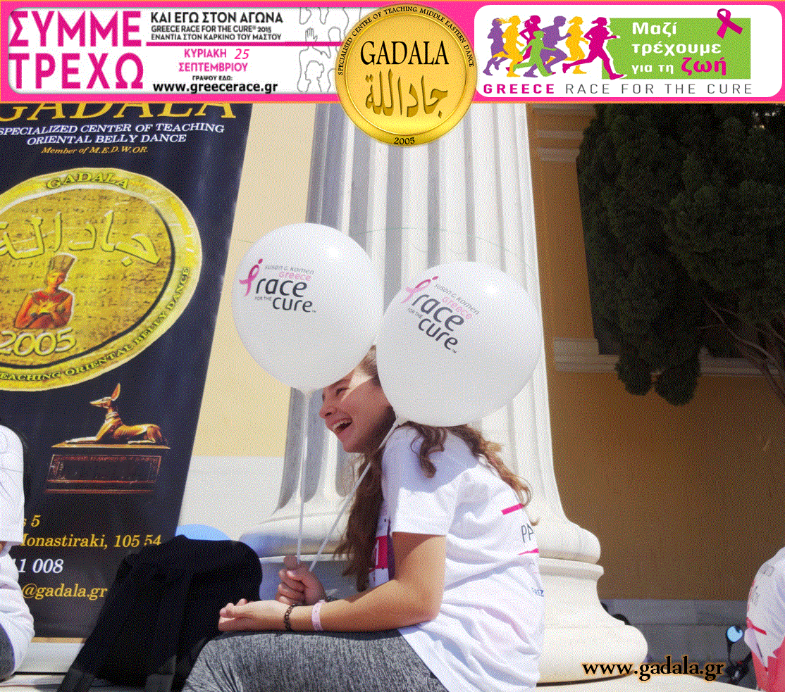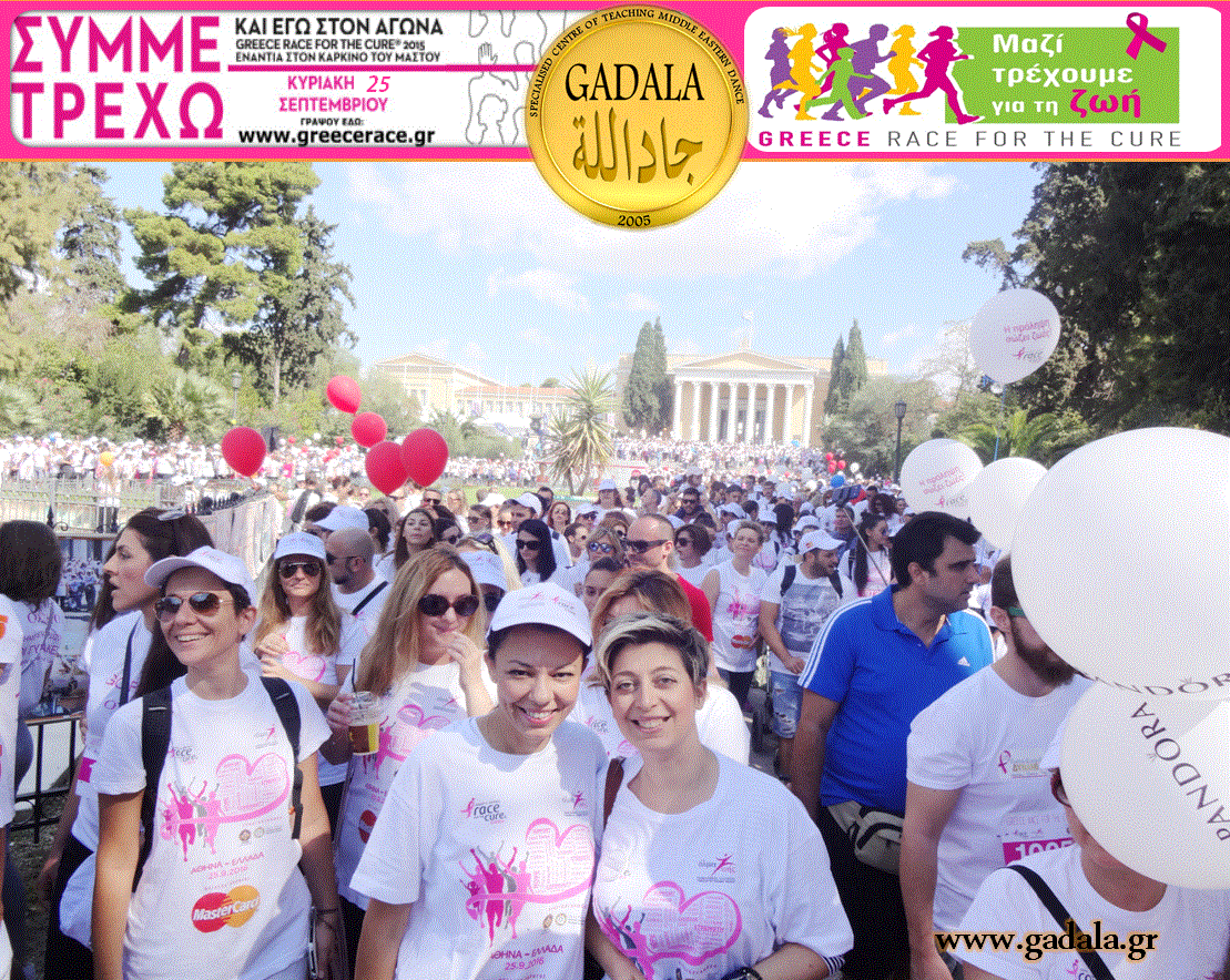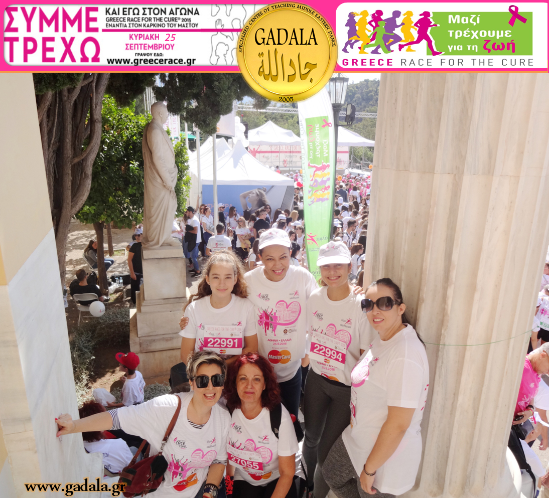 Στα πλαίσια αυτής της ευαισθητοποίησης γύρω από τις συχνότερες δυσκολίες που συναντούν σήμερα οι γυναίκες και ειδικότερα την αντιμετώπιση του καρκίνου, το Εξειδικευμένο Κέντρο Διδασκαλίας Ανατολίτικου Χορού GADALA πήρε μέρος με σύσσωμη όλη την Oriental Ομάδα «GADALA Εξειδικευμένο Κέντρο Διδασκαλίας Ανατολίτικου Χορού», η οποία συμπεριλάμβανε μαθήτριες, σπουδάστριες, χορευτές και χορεύτριες bellydance, δασκάλες, με αρχηγό δασκάλα την κα Φωτεινή Gadala στον φιλανθρωπικό Αγώνα Δρόμου «Greece Race For The Cure 2016».