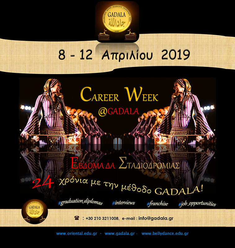 Το Τμήμα Πιστοποίησης Σπουδών και η Κεντρική Διεύθυνση FRANCHISE του Ε.Κ.Δ.Α.Χ. GADALA, με μεγάλη χαρά ανακοινώνει την διεξαγωγή της "Εβδομάδας Σταδιοδραμίας" για το έτος 2019 που θα πραγματοποιηθεί από την Δευτέρα 08 Απριλίου 2019 έως και την Παρασκευή 12 Απριλίου 2019, στις εγκαταστάσεις του Εξειδικευμένου Κέντρου Διδασκαλίας Ανατολίτικου Χορού GADALA (Υψηλάντου & Καποδιστρίου 35, Γαλάτσι).