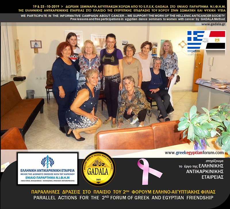 Με μεγάλη επιτυχία ολοκληρώθηκαν τα βιωματικά σεμινάρια ανατολίτικου χορού που οργάνωσε το Ενιαίο Παράρτημα Ν.Ι.Φ.Η.Μ. της Ελληνικής Αντικαρκινικής Εταιρείας σε συνεργασία με το Ε.Π.Ε.Κ "GADALA στο πλαίσιο των παράλληλων δράσεων του 2ου Φόρουμ Ελληνο-Αιγυπτιακής Φιλίας.