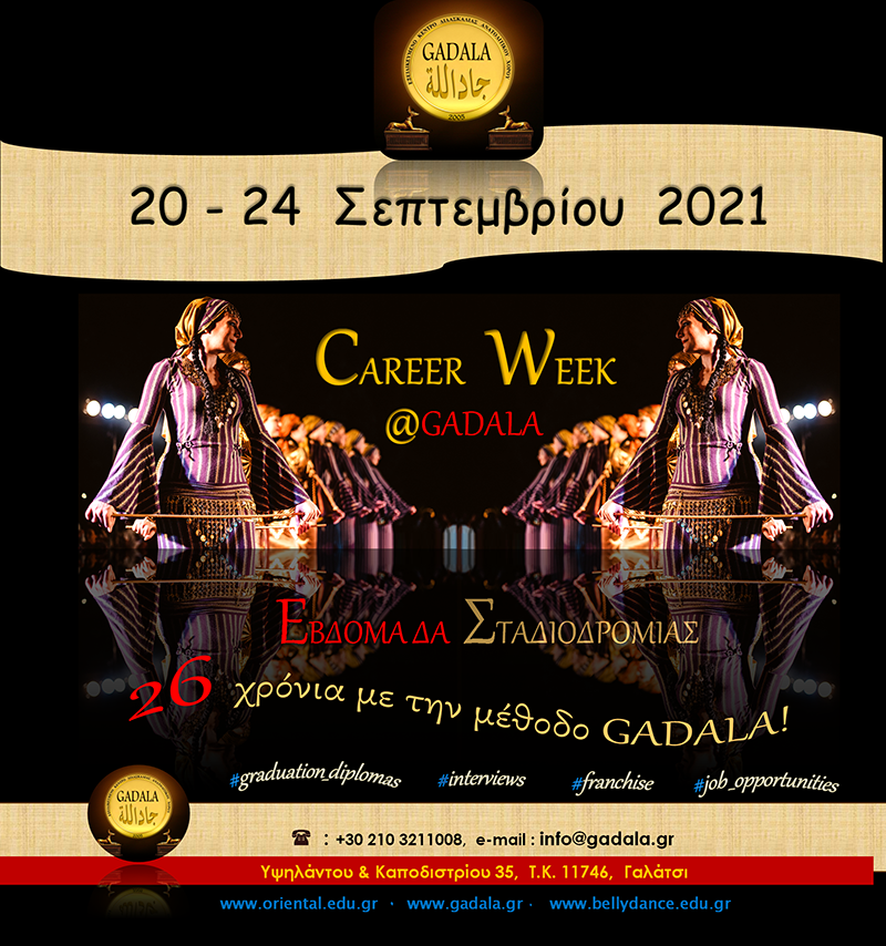 Το Τμήμα Πιστοποίησης Σπουδών και η Κεντρική Διεύθυνση FRANCHISE του Ε.Π.Ε.Κ. GADALA, με μεγάλη χαρά ανακοινώνει την διεξαγωγή της "Εβδομάδας Σταδιοδραμίας" για το έτος 2021 που θα πραγματοποιηθεί από την Δευτέρα 20 Σεπτεμβρίου 2021 έως και την Παρασκευή 24 Σεπτεμβρίου 2021, στις εγκαταστάσεις του Εξειδικευμένου Κέντρου Διδασκαλίας Ανατολίτικου Χορού GADALA (Υψηλάντου & Καποδιστρίου 35, Γαλάτσι).