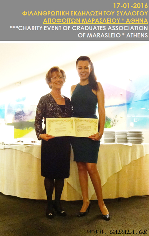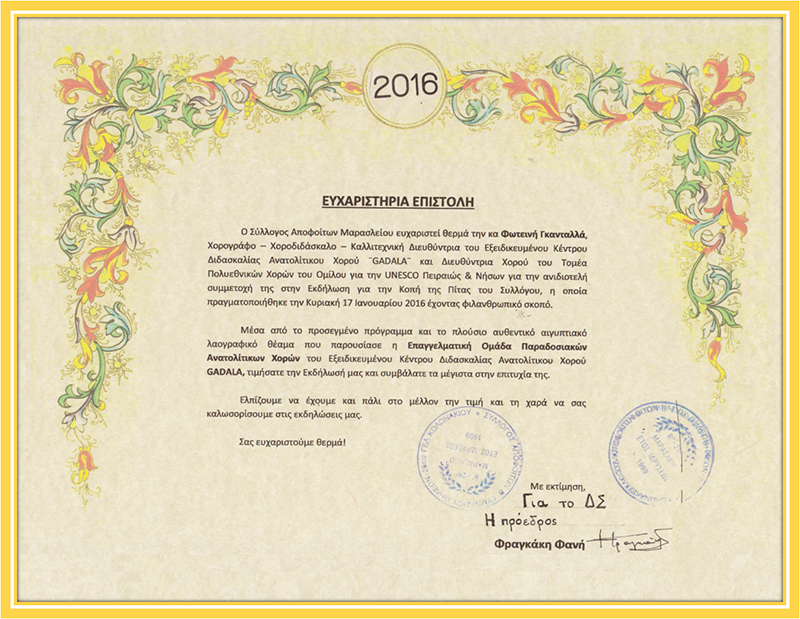 Με το πέρας της εκδήλωσης ακολούθησε η απονομή ευχαριστήριας επιστολής στην κα Φωτεινή Gadala για την ανιδιοτελή προσφορά της και συμμετοχή της Επαγγελματικής Ομάδα Παραδοσιακού Αιγυπτιακού Χορού του Εξειδικευμένου Κέντρου Διδασκαλίας Ανατολίτικου Χορού GADALA στην Εκδήλωση του Συλλόγου που πραγματοποιήθηκε την Κυριακή 17 Ιανουαρίου 2016 στο Amalia Hotel στο Σύνταγμα και τη μέγιστη συμβολή προς την επιτυχία της. Την επιστολή απένειμε η Πρόεδρος ΔΣ του Συλλόγου Αποφοίτων Μαρασλείου, κα Φανή Φραγκάκη.