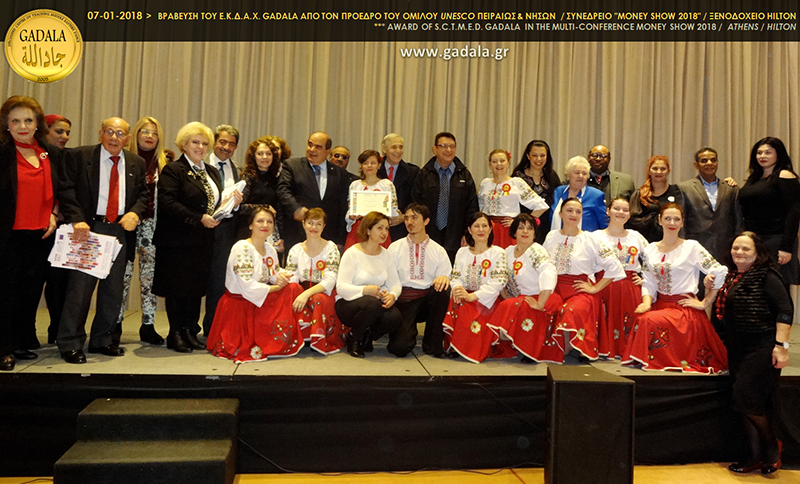 Με την ιδιότητά της ως Διευθύντρια Χορού του Τομέα Πολυεθνικών Χορών του Ομίλου για την UNESCO Πειραιώς & Νήσων η κα Φωτεινή Gadala θα ήθελε να συγχαρεί τον κο Ιωάννη Μαρωνίτη, Πρόεδρο του Ομίλου για την UNESCO Πειραιώς και Νήσων και Μέλος του Εκτελεστικού Συμβουλίου της Παγκόσμιας Ομοσπονδίας Ομίλων, Συλλογών και Κέντρων UNESCO (WFUCA) για την Ευρώπη και τη Βόρεια Αμερική, για την πρωτοβουλία και την άψογη διοργάνωση της «Μεγάλης Πολυπολιτισμικής Γιορτής», η οποία πραγματοποιήθηκε το τριήμερο 7, 8 και 9 Ιανουαρίου 2018 στο Athens Hilton Hotel, στα πλαίσια του πολιτιστικού & καλλιτεχνικού προγράμματος του πολυσυνεδρίου “MONEY SHOW 2018”.