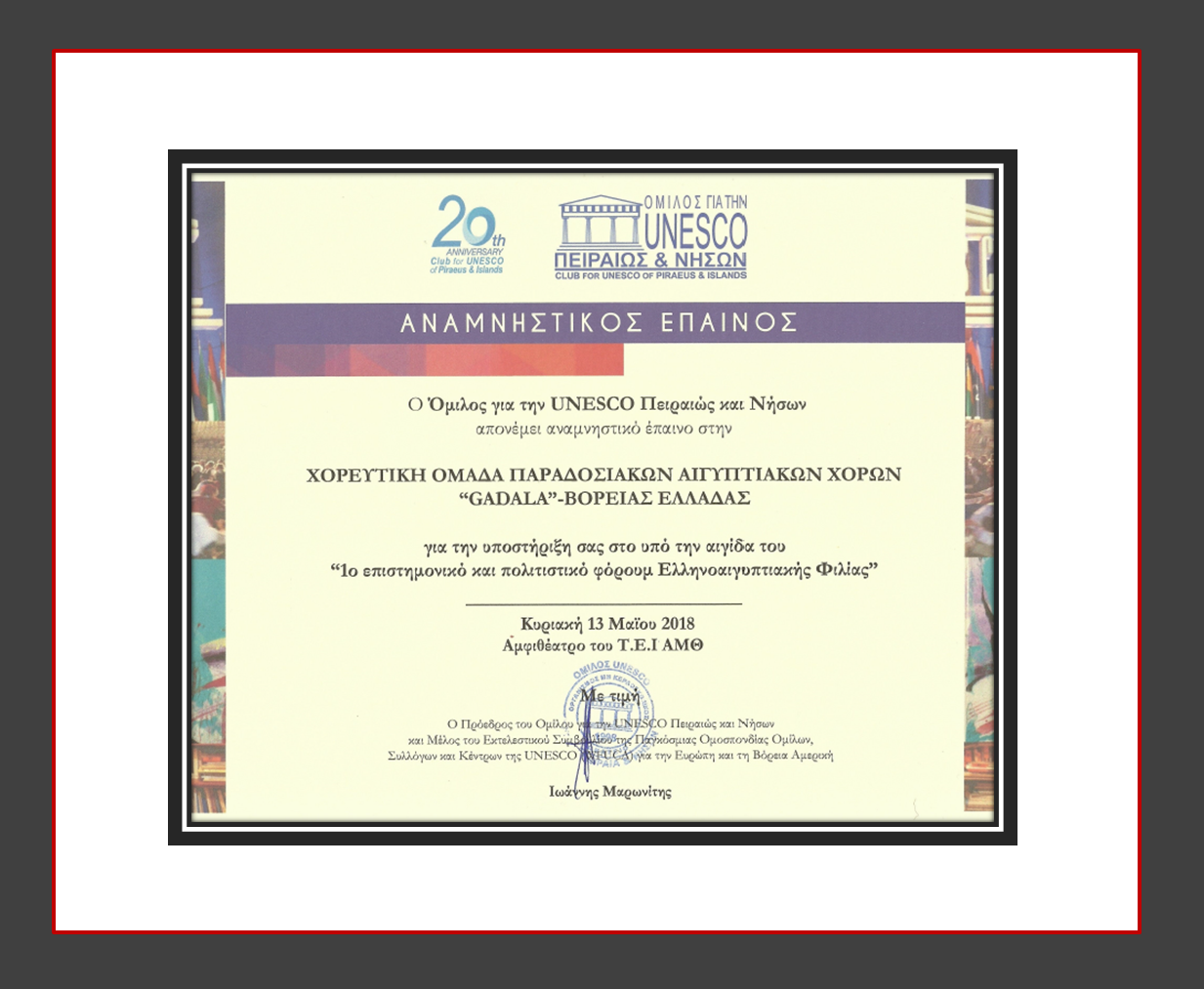 Η κα Φωτεινή Gadala νιώθει ευγνώμων για την τιμητική διάκριση που απονεμήθηκε στην Επαγγελματική Χορευτική Ομάδα Παραδοσιακών Αιγυπτιακών Χορών "GADALA" - ΒΟΡΕΙΑΣ ΕΛΛΑΔΑΣ προκειμένου να τιμήσει την συνεισφορά της στις Δράσεις Πολιτισμού και ευχαριστεί θερμά τον Όμιλο για την UNESCO Πειραιώς και Νήσων για την αναγνώριση των προσπαθειών της να συνεισφέρει στη διάδοση του ανατολίτικου χορού και της πλούσιας Αιγυπτιακής κουλτούρας.