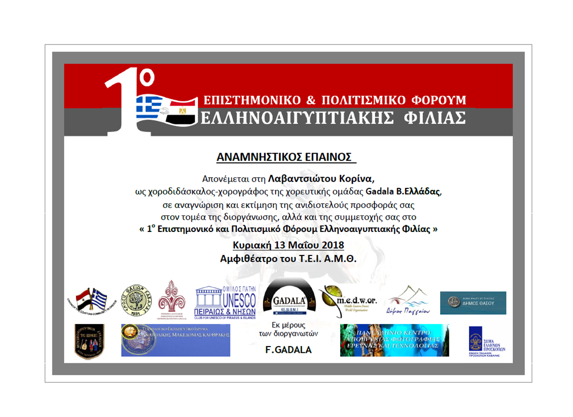Τέλος, ως Καλλιτεχνική Διευθύντρια του Κ.Δ.Μ.M. GADALA, η κα Φωτεινή Gadala, θα ήθελε με μεγάλη της χαρά να συγχαρεί δημόσια τους εξαιρετικούς χορευτές της -νεοσύστατης- Επαγγελματικής Χορευτικής Ομάδας GADALA - Βόρειας Ελλάδας, για την επιτυχημένη παρουσίαση και ανιδιοτελή συμμετοχή τους στο Φορουμ, ενώ με την ιδιότητά της ως Διευθύντρια Χορού του Τομέα Πολυεθνικών Χορών του Ομίλου για την UNESCO Πειραιώς & Νήσων, βαθιά συγκινημένη και γεμάτη όμορφες αναμνήσεις, ευχαριστεί μέσα από την καρδιά της όλους όσους συνέβαλλαν στο να πραγματοποιηθεί αυτό το μεγάλο εγχείρημα, το 1ο Επιστημονικό και Πολιτισμικό Φόρουμ Ελληνοαιγυπτιακής Φιλίας με εξαιρετική επιτυχία!